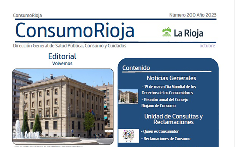 La Dirección General de Salud Pública, Consumo y Cuidados del Gobierno de La Rioja ha retomado la edición en formato digital de la revista ConsumoRioja, que dejó de publicarse en papel en 2007, para difundir las actividades que, desde el área de Consumo se realizan para la protección de los derechos de los consumidores riojanos.
