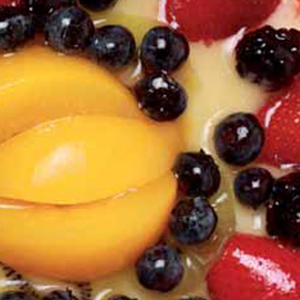 Se pelan y se trocean las frutas, colocándolas en copas de cristal. Se cubren con las natillas y para adornar ponemos en el centro una finita capa de kiwi, una rodajita de plátano y ½ fresa.