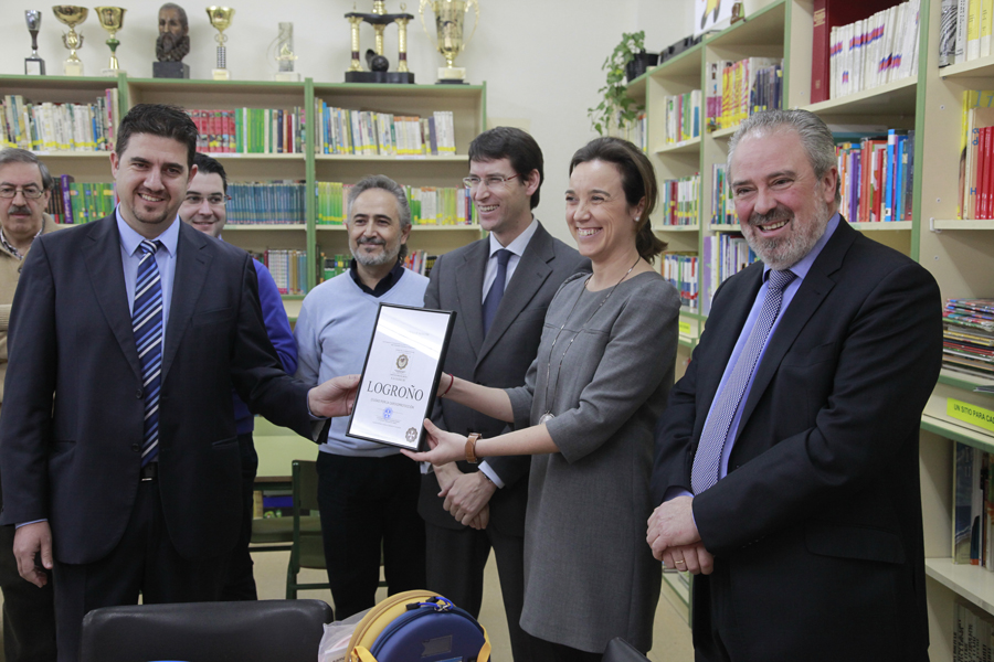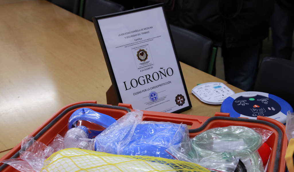 Durante la visita, la alcaldesa de Logroño, Cuca Gamarra, ha recogido el distintivo Ciudad de Cardioprotección, otorgado a la ciudad por Proyecto Salvavidas. Se trata de un reconocimiento al consistorio logroñés “por haber instalado desfibriladores en centros públicos, por la lucha de la capital riojana contra la muerte súbita”. Proyecto Salvavidas también ha destacado que La Rioja es pionera en España en programas de prevención de riesgos laborales.