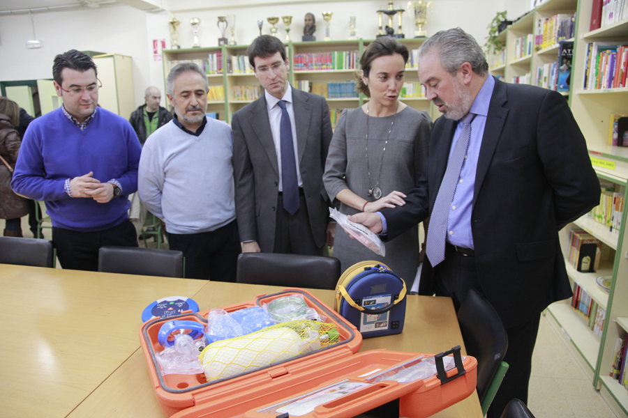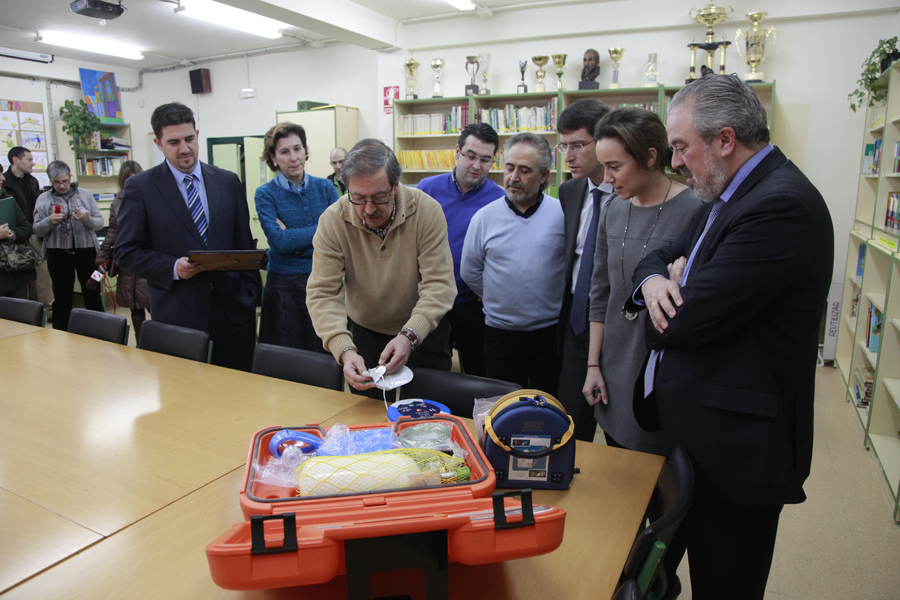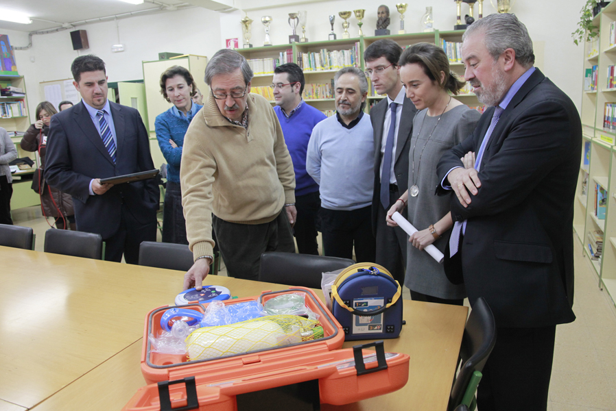 Los consejeros de Educación, Cultura y Turismo, Gonzalo Capellán, y Salud y Servicios Sociales, José Ignacio Nieto, acompañados por la alcaldesa de Logroño, Cuca Gamarra, han visitado hoy el colegio Doctor Castroviejo de Logroño, uno de los centros de Educación Infantil y Primaria en los que el Gobierno de La Rioja ha instalado durante este curso desfibriladores semiautomáticos externos.
