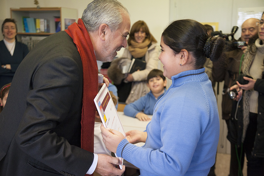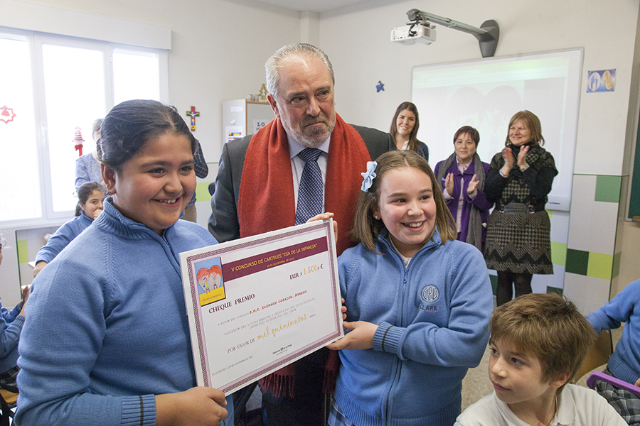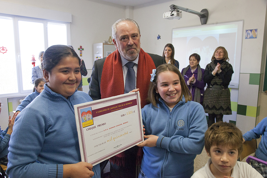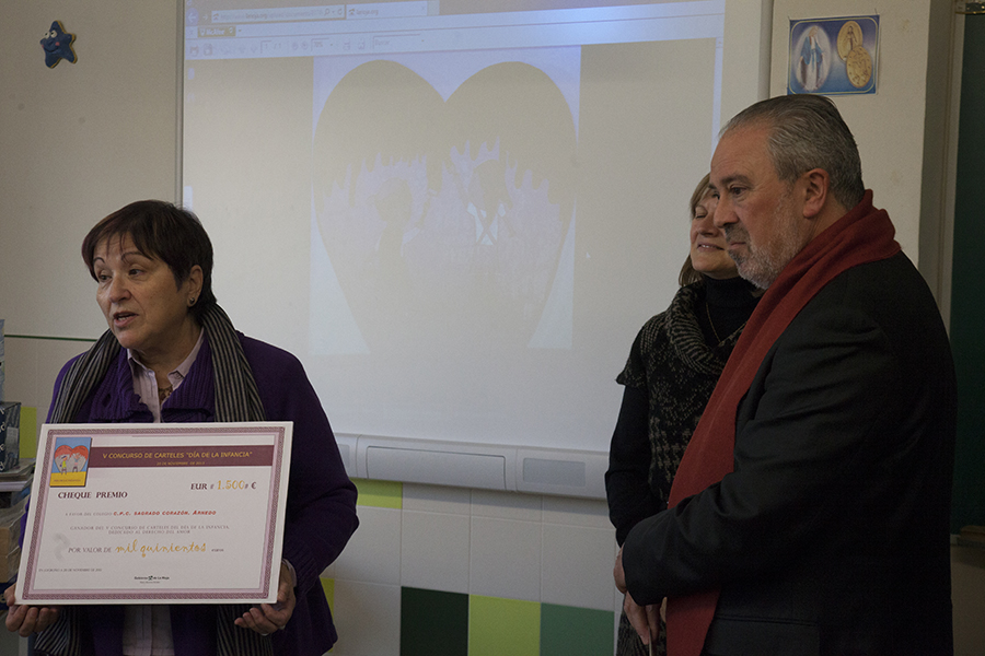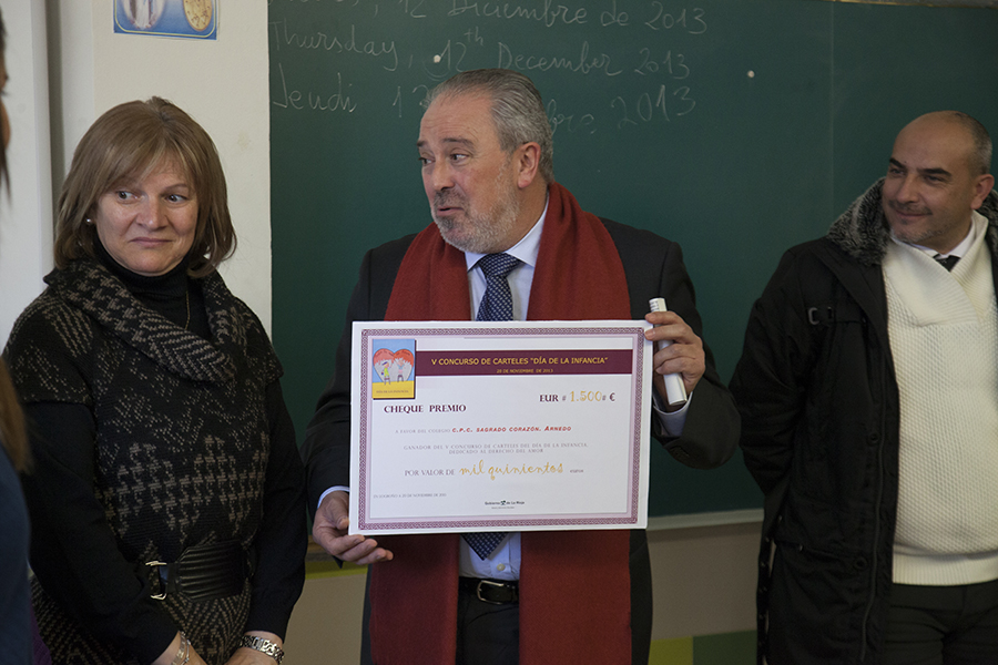 El consejero de Salud y Servicios Sociales, José Ignacio Nieto, y la directora general de Servicios Sociales, Carmen Corral, han entregado hoy, en Arnedo, el premio correspondientes al ‘V Concurso de carteles conmemorativos del Día Internacional de la Infancia’, que ha recaído en el colegio Sagrado Corazón de Arnedo, gracias al dibujo que realizaron un grupo de alumnos de quinto de primaria.