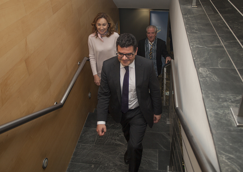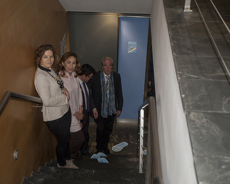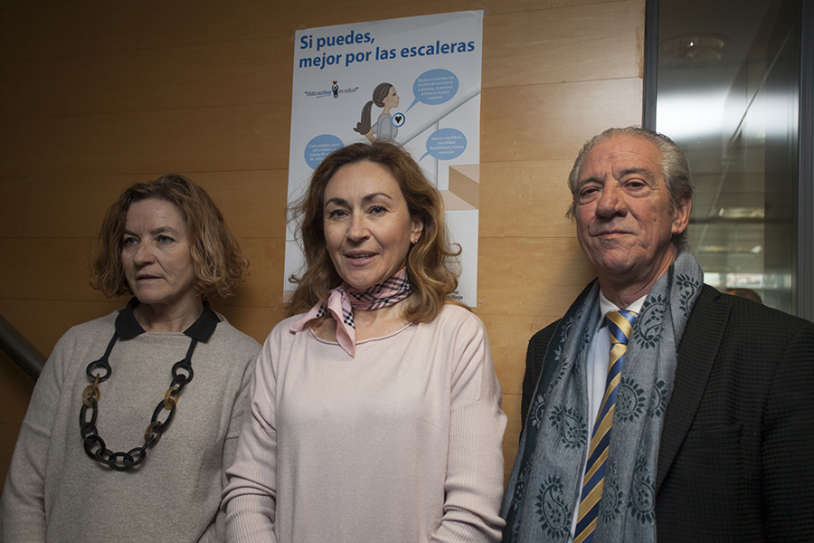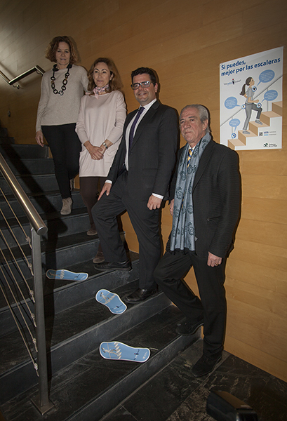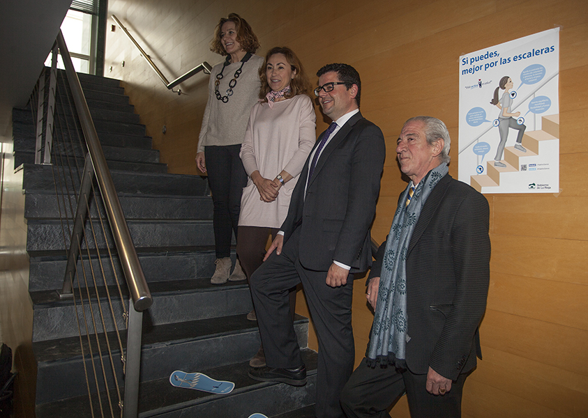 La consejera de Salud, María Martín, y el consejero de Administración Pública y Hacienda, Alfonso Domínguez, han dado a conocer hoy, junto a las escaleras de la Consejería de Administración Pública y Hacienda, algunos de los elementos (adhesivos, láminas, vinilos, carteles, etc.) que forman parte de la campaña puesta en marcha por el Servicio de Promoción de la Salud para fomentar el uso de escaleras y promover la actividad física, haciendo coincidir esta actuación con la celebración, el próximo día 6 de abril, del Día Mundial del Ejercicio Físico. En el acto también han tomado parte la directora general de Salud Pública y Consumo, Rosa López, y el presidente del Colegio de Administradores de Fincas de La Rioja, Constantino Pascual.