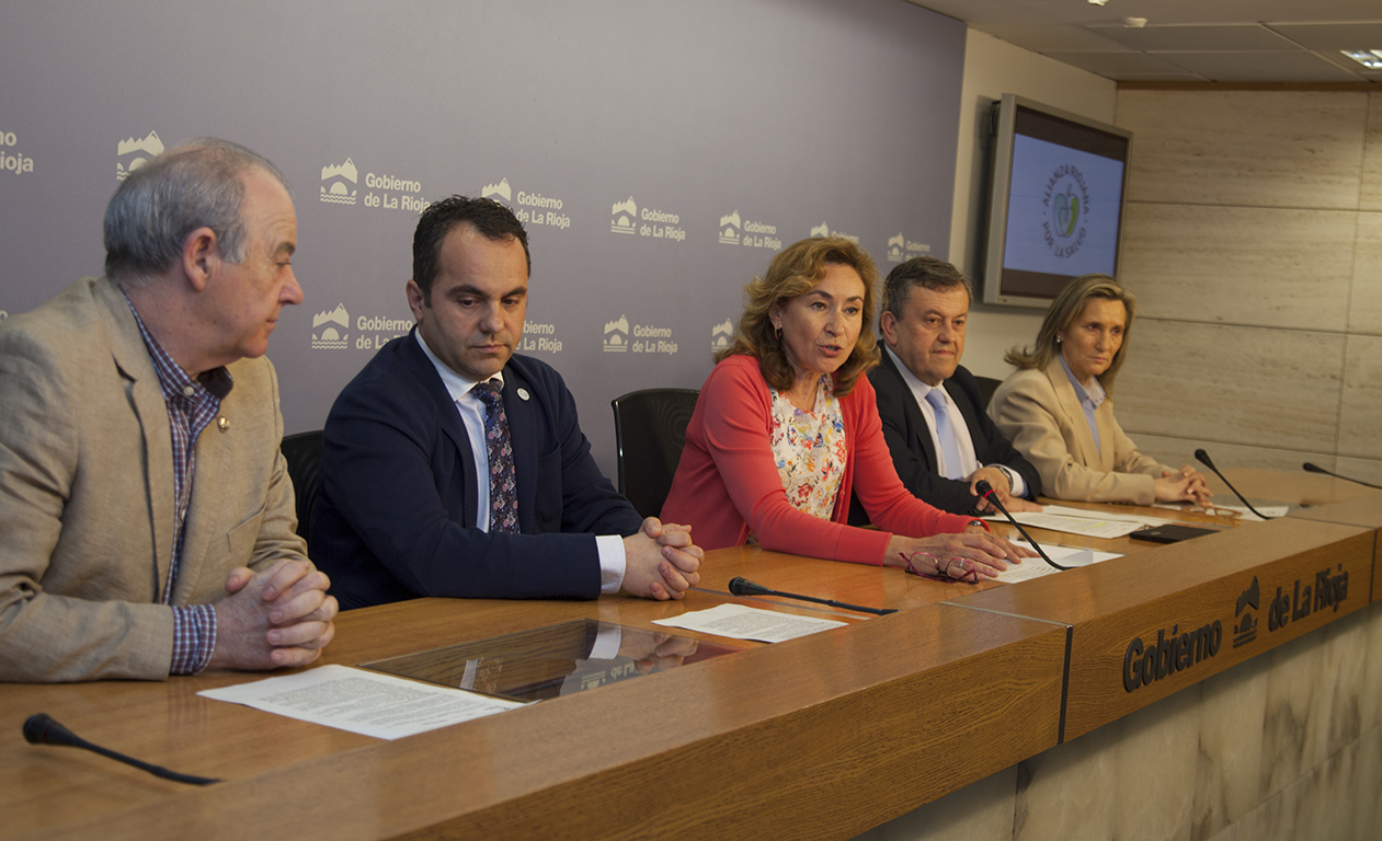 La consejera de Salud, María Martín, acompañada del director general de Salud Pública y Consumo, Juan Ramón Rábade, ha presentado esta mañana el programa de actividades organizadas en torno a la Alianza Riojana por la Salud para los meses de abril, mayo y junio, y que tendrán su continuidad a lo largo de 2018 y 2019. En la rueda de prensa han participado también los presidentes de los Colegios de Médicos, Inmaculada Martinez, de Enfermería, Pedro Vidal, y de Farmacéuticos, Mario Domínguez, miembros de la Alianza y colaboradores de estas nuevas iniciativas.