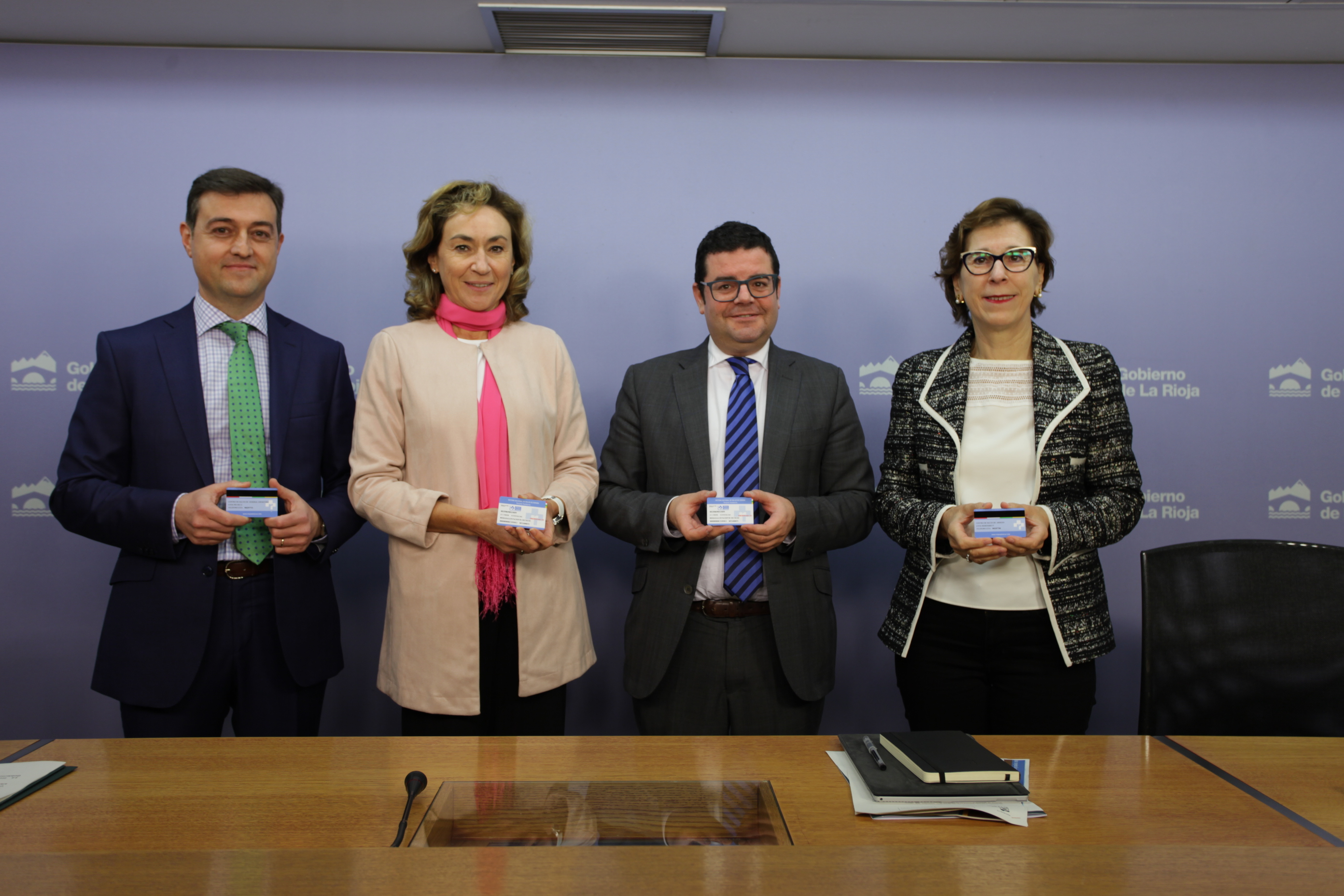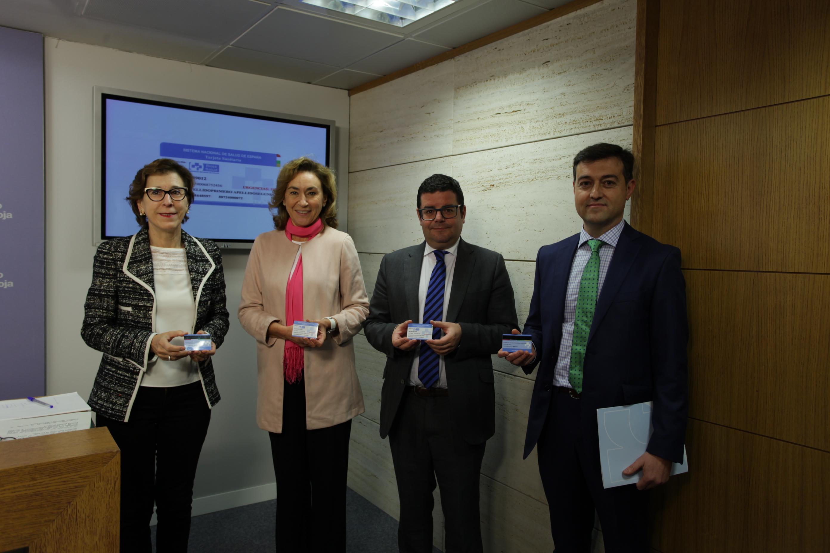 Los consejeros de Administración Pública y Hacienda, Alfonso Domínguez, y de Salud, María Martín, junto con la directora general de Prestaciones y Farmacia, Carmen Sáenz Pastor, y el director de Innovación Sanitaria, Juan Carlos Oliva, han presentado esta mañana la nueva Tarjeta Sanitaria Individual de La Rioja que ya está adaptada al formato único y común de todo el Sistema Nacional de Salud.