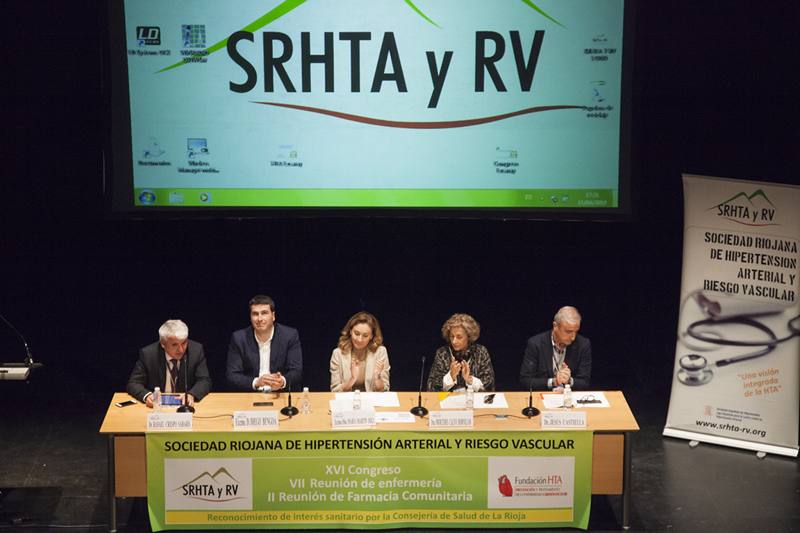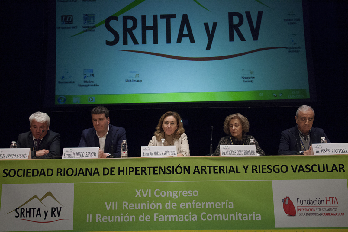 La consejera de Salud, María Martín, ha inaugurado hoy en el Teatro Real de Ezcaray el XVI Congreso de la Sociedad Riojana de Hipertensión Arterial y Riesgo Vascular, la VII reunión de Enfermería y la II reunión de Farmacia Comunitaria, “tres citas que suman esfuerzos para aglutinar a más de 150 profesionales implicados en la prevención, diagnóstico y tratamiento de las personas que padecen Hipertensión Arterial, así como de los factores de Riesgo Cardiovascular”.