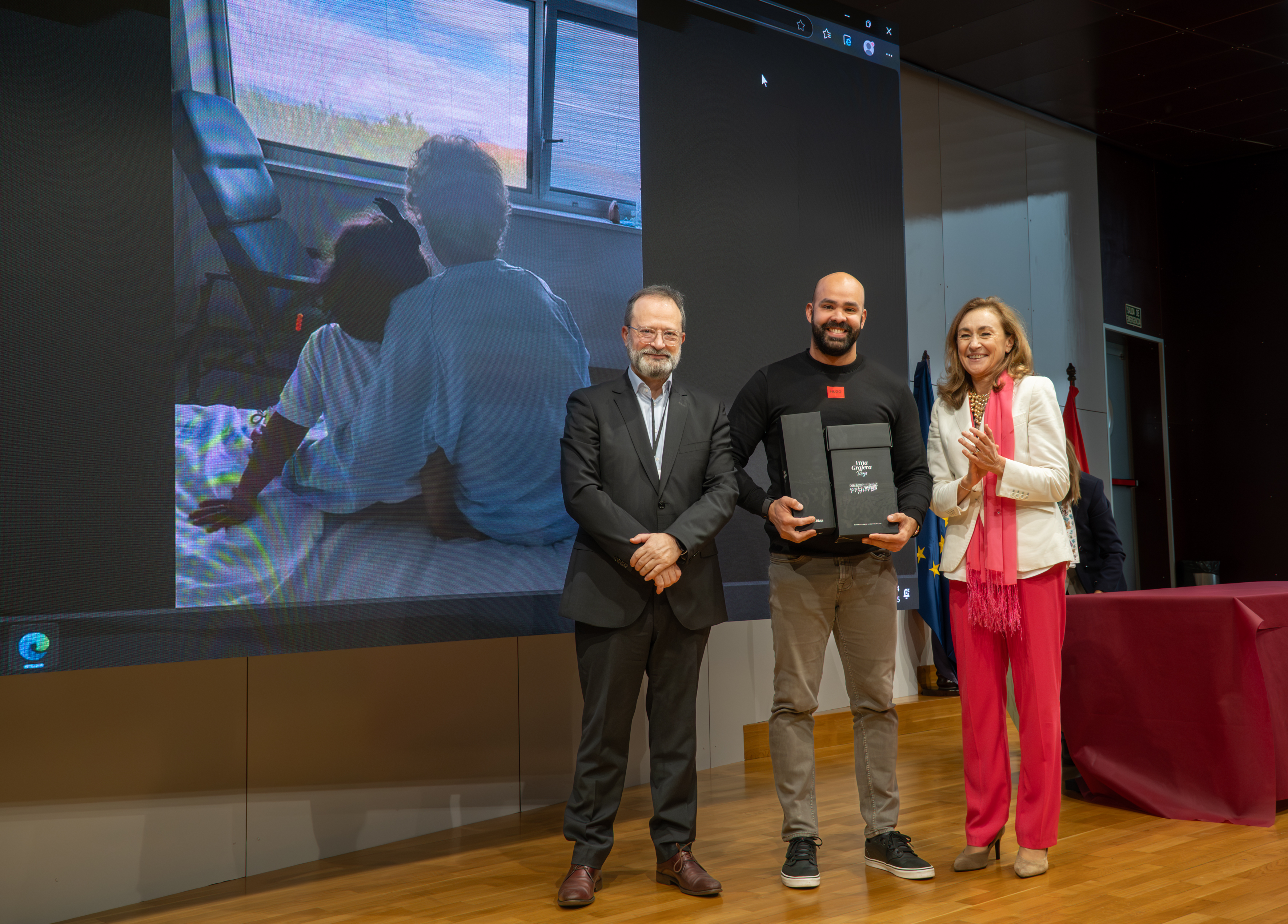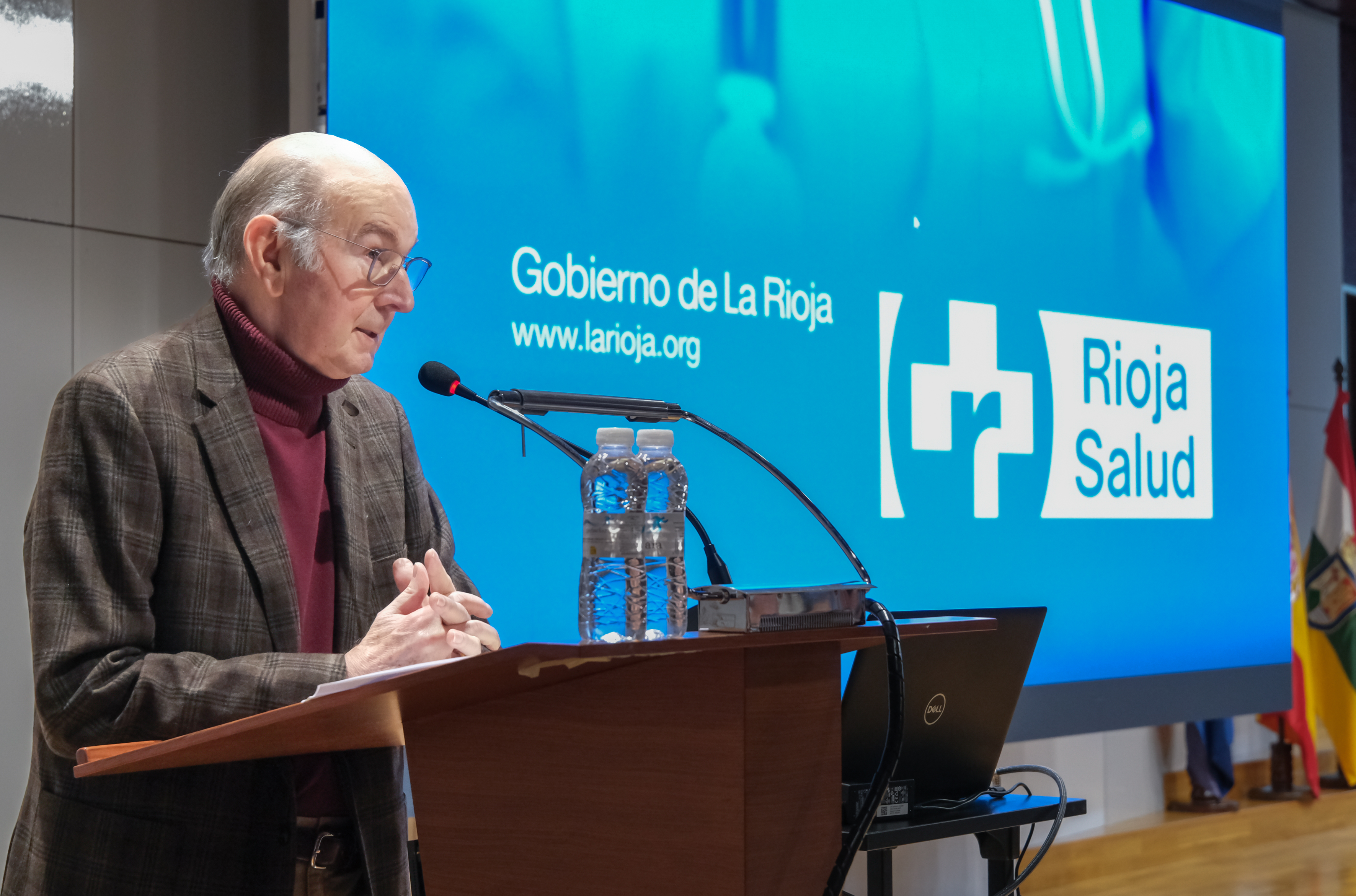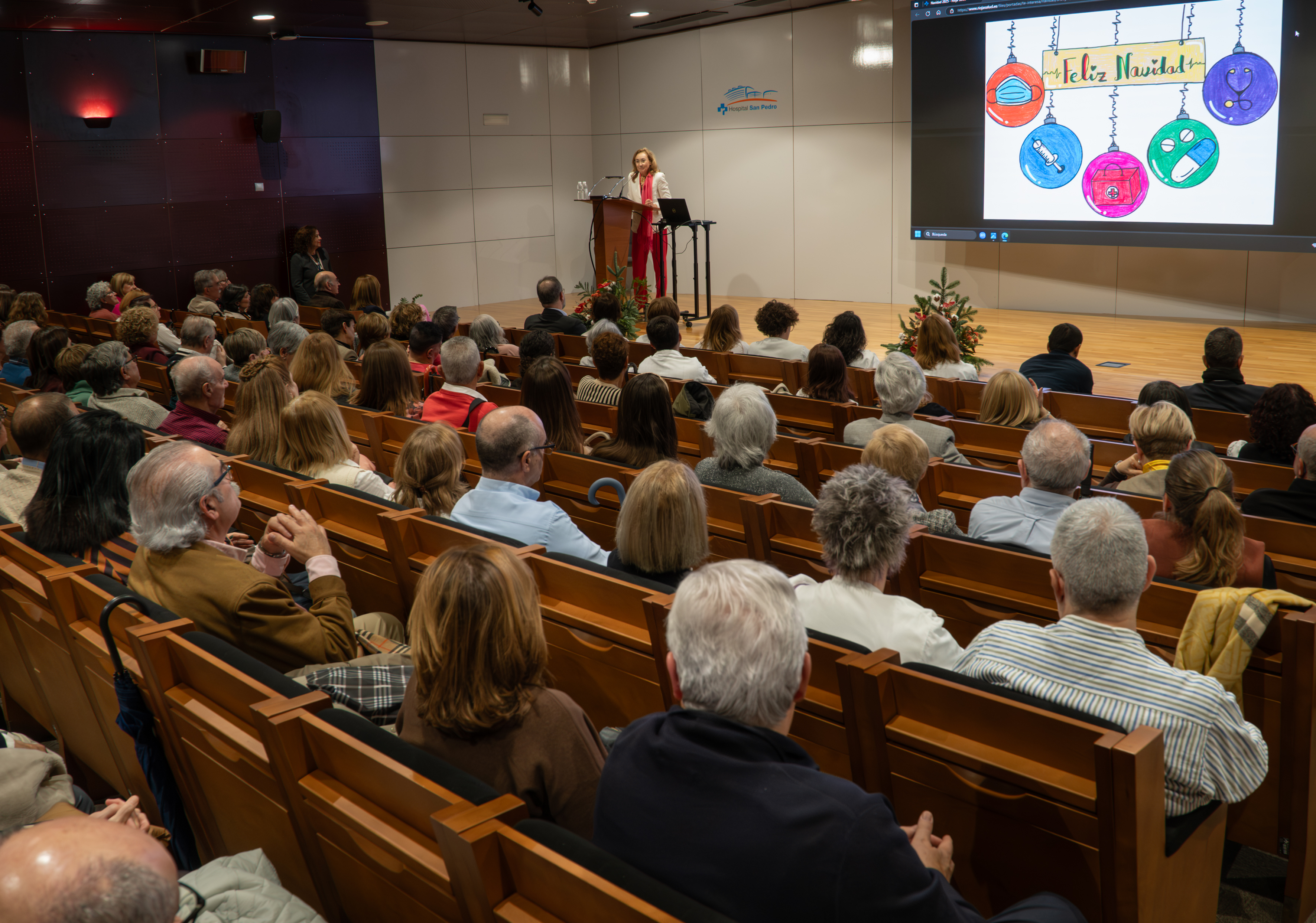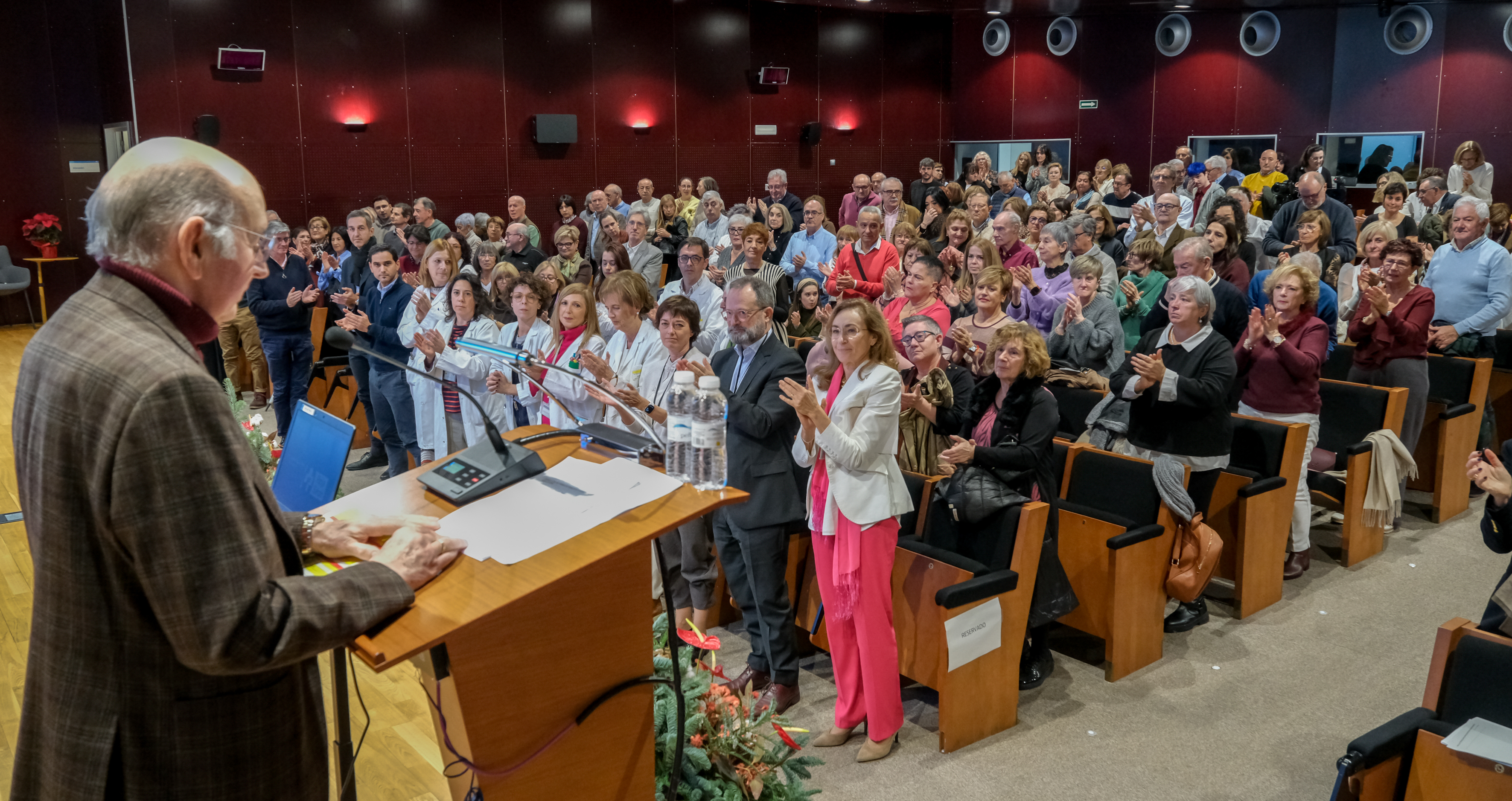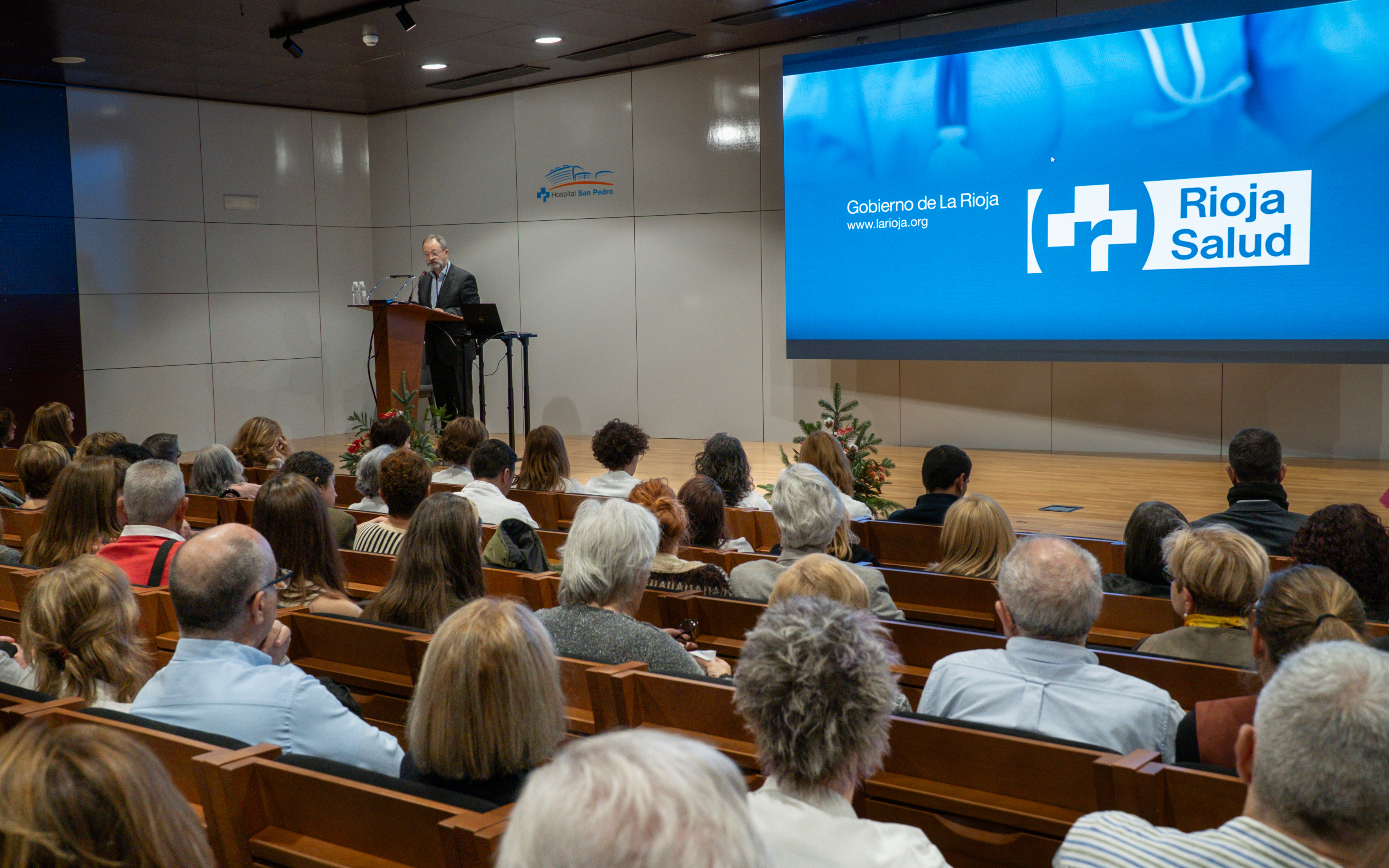 El salón de actos del Hospital Universitario San Pedro ha acogido este acto de reconocimiento a los trabajadores y profesionales del SERIS que, por categorías profesionales, se distribuyen de la siguiente manera: 32 médicos, 28 enfermeras, 18 celadores, 31 Técnicos en Cuidados Auxiliares de Enfermería, 8 pinches, 15 personas del grupo administrativo, y otro personal como matronas o telefonistas.