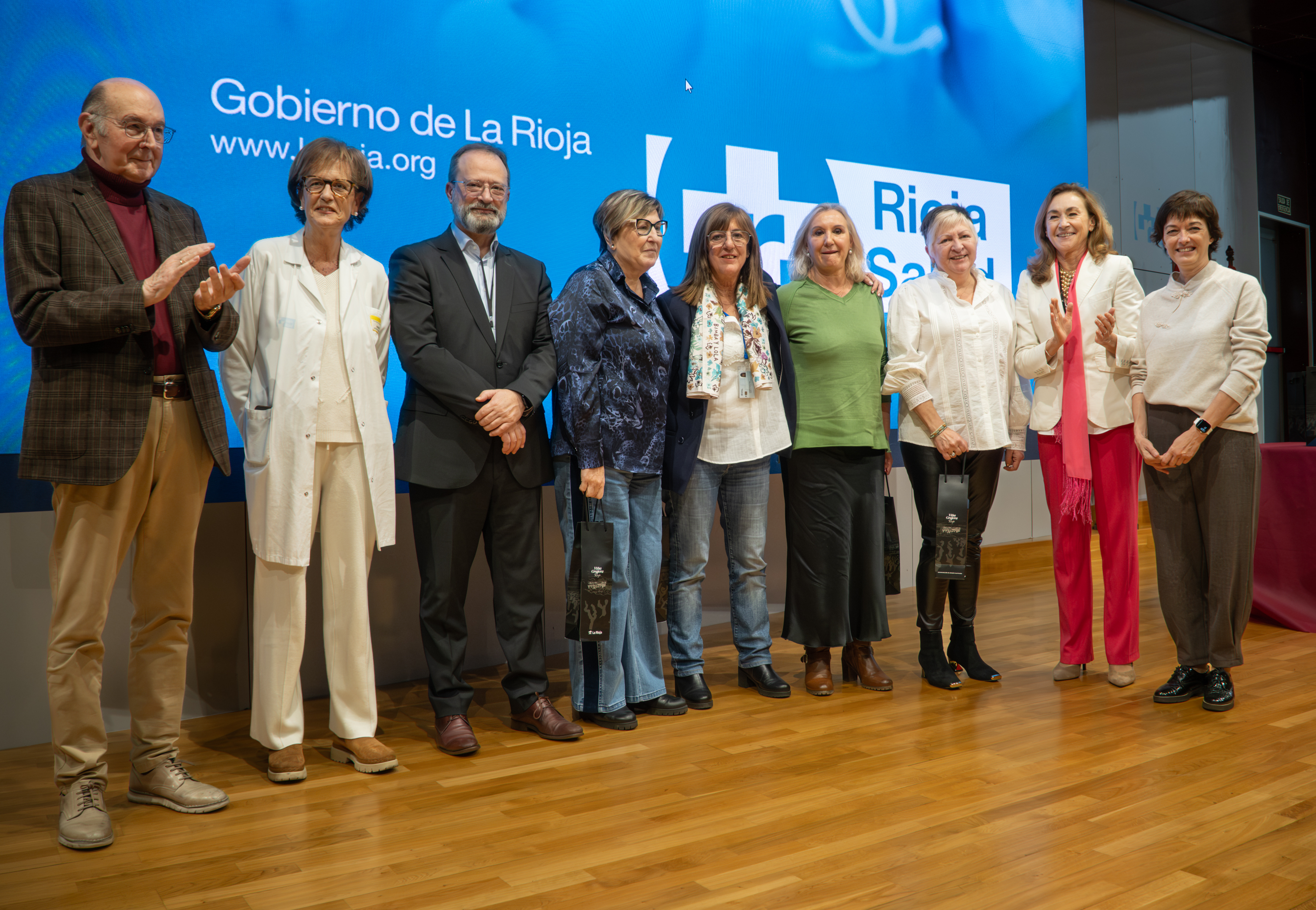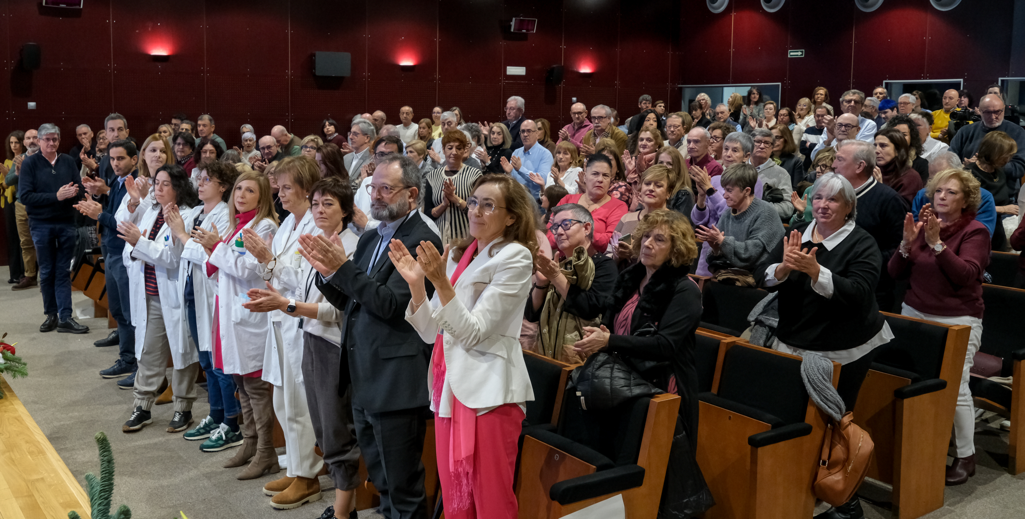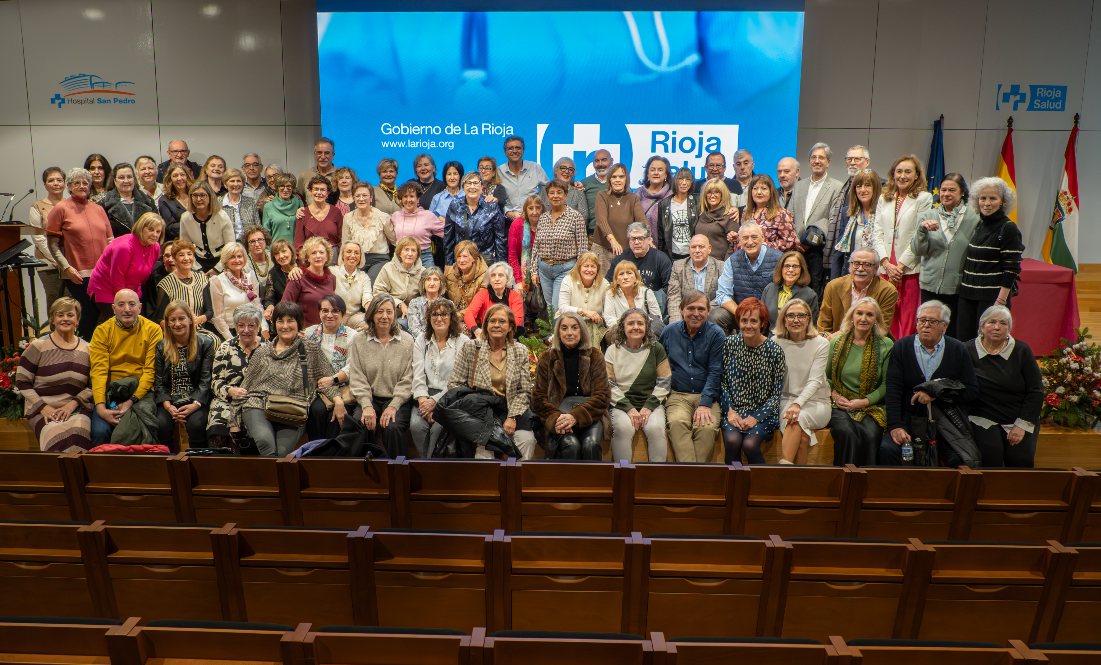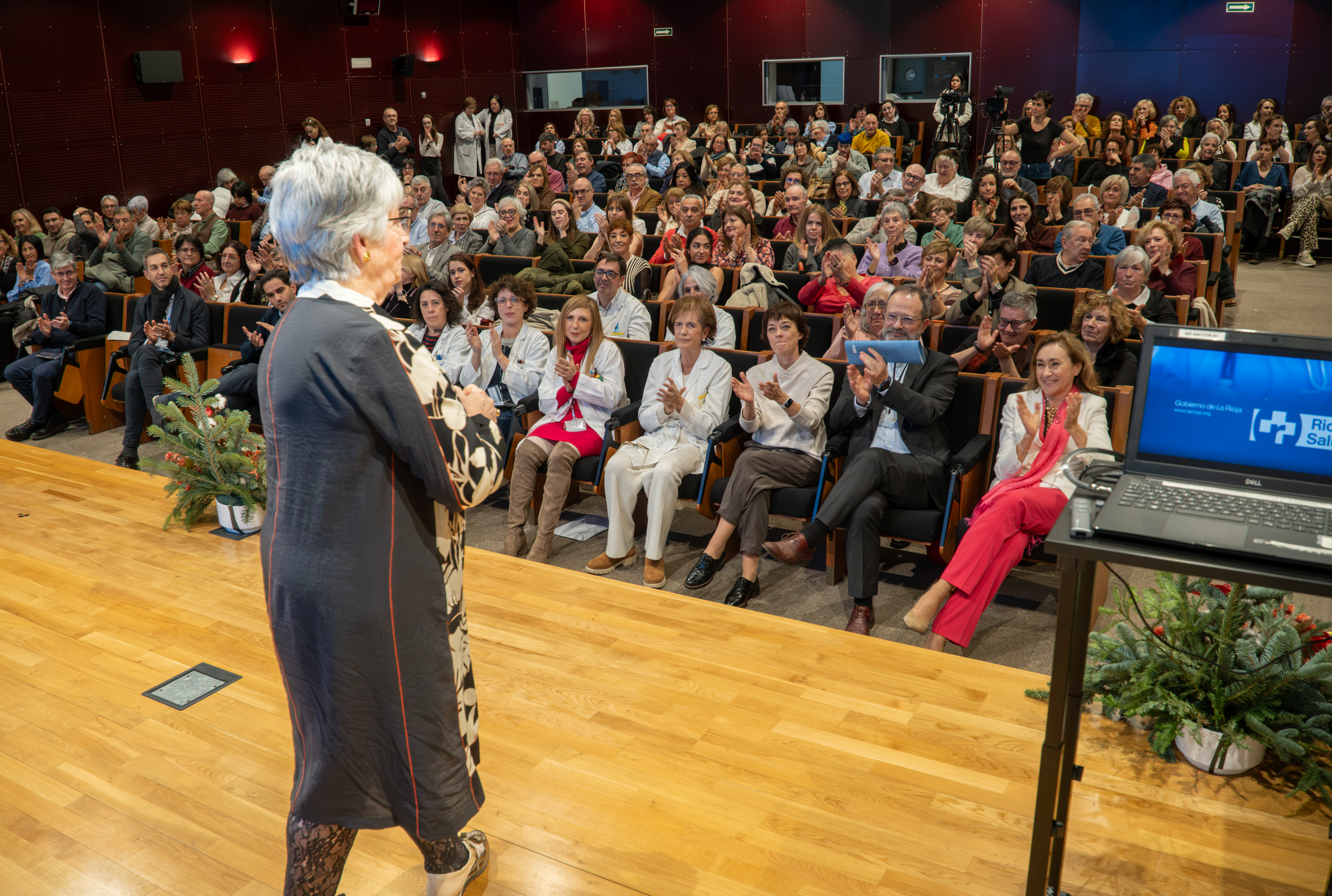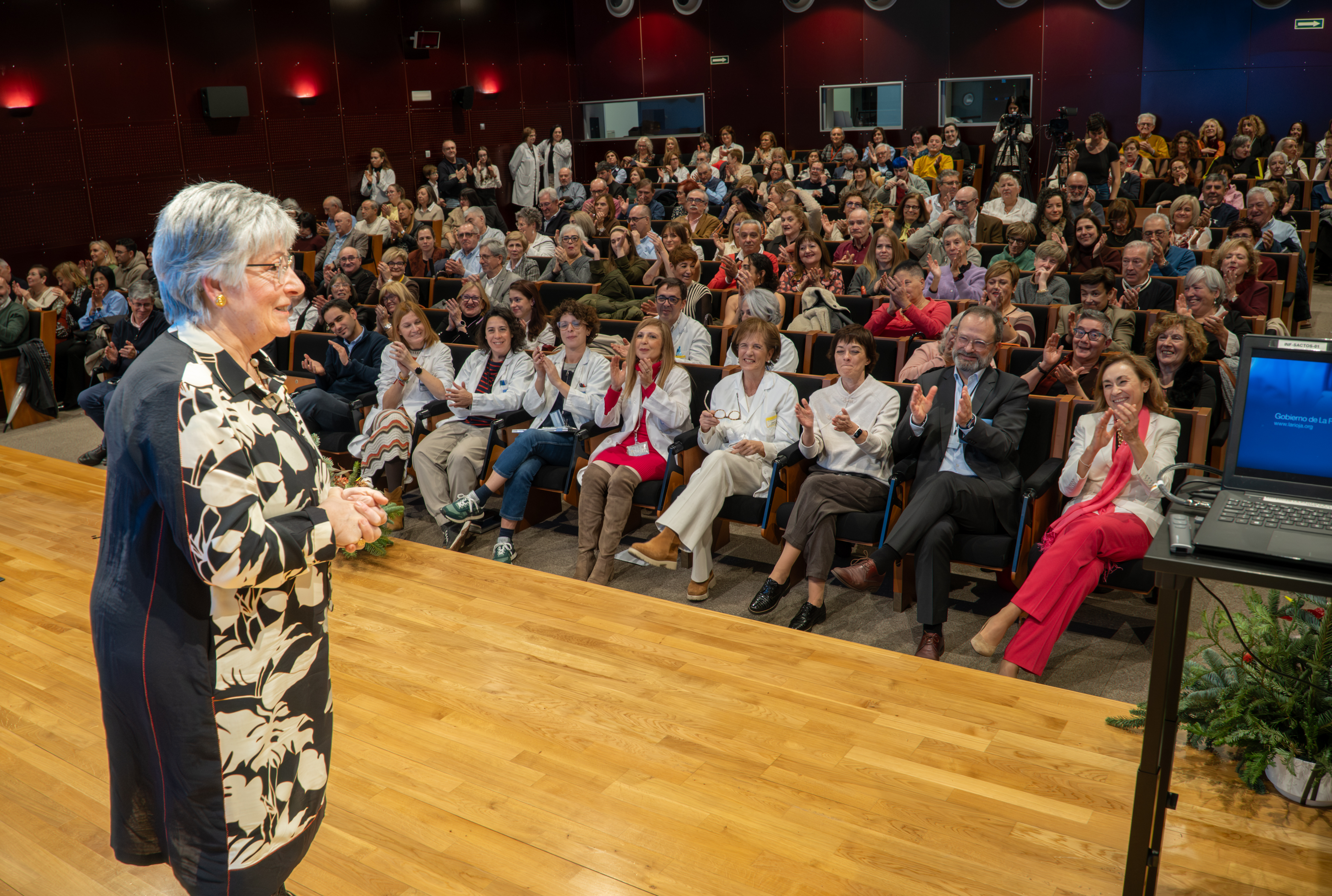 La consejera de Salud y Políticas Sociales, María Martín, acompañada por el gerente del SERIS, Luis Ángel González, ha participado hoy, 19 de diciembre, en Logroño, en el homenaje que el Servicio Riojano de Salud (SERIS) ha brindado a los 136 profesionales de Atención Primaria y Hospitalaria que se han jubilado a lo largo de 2025.