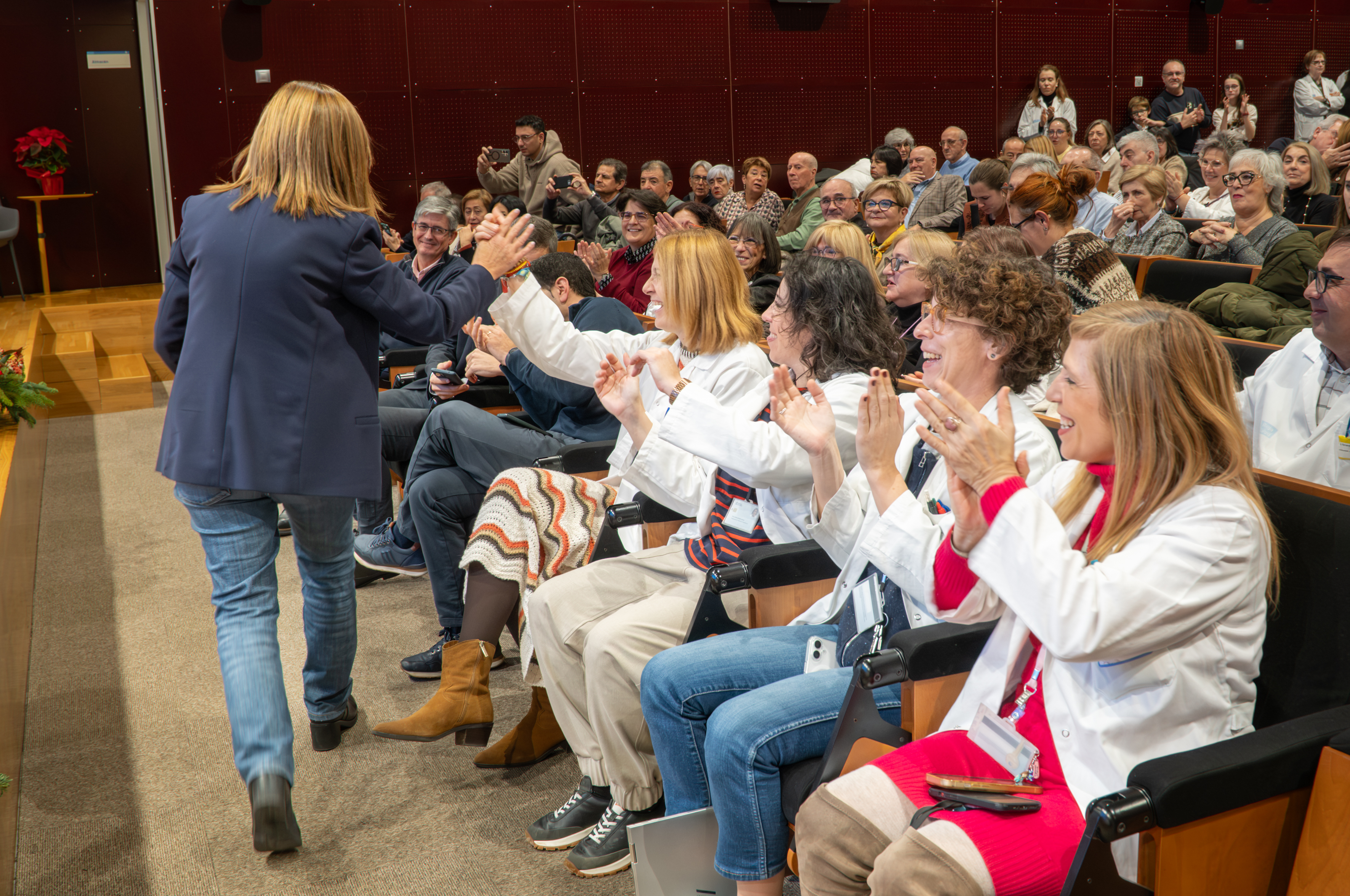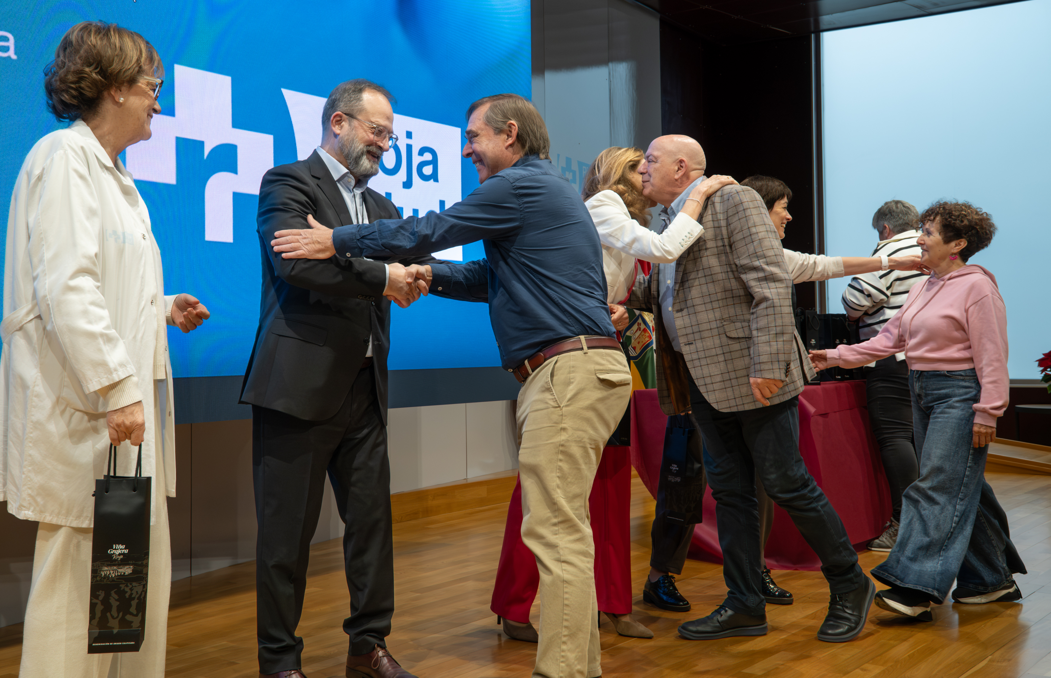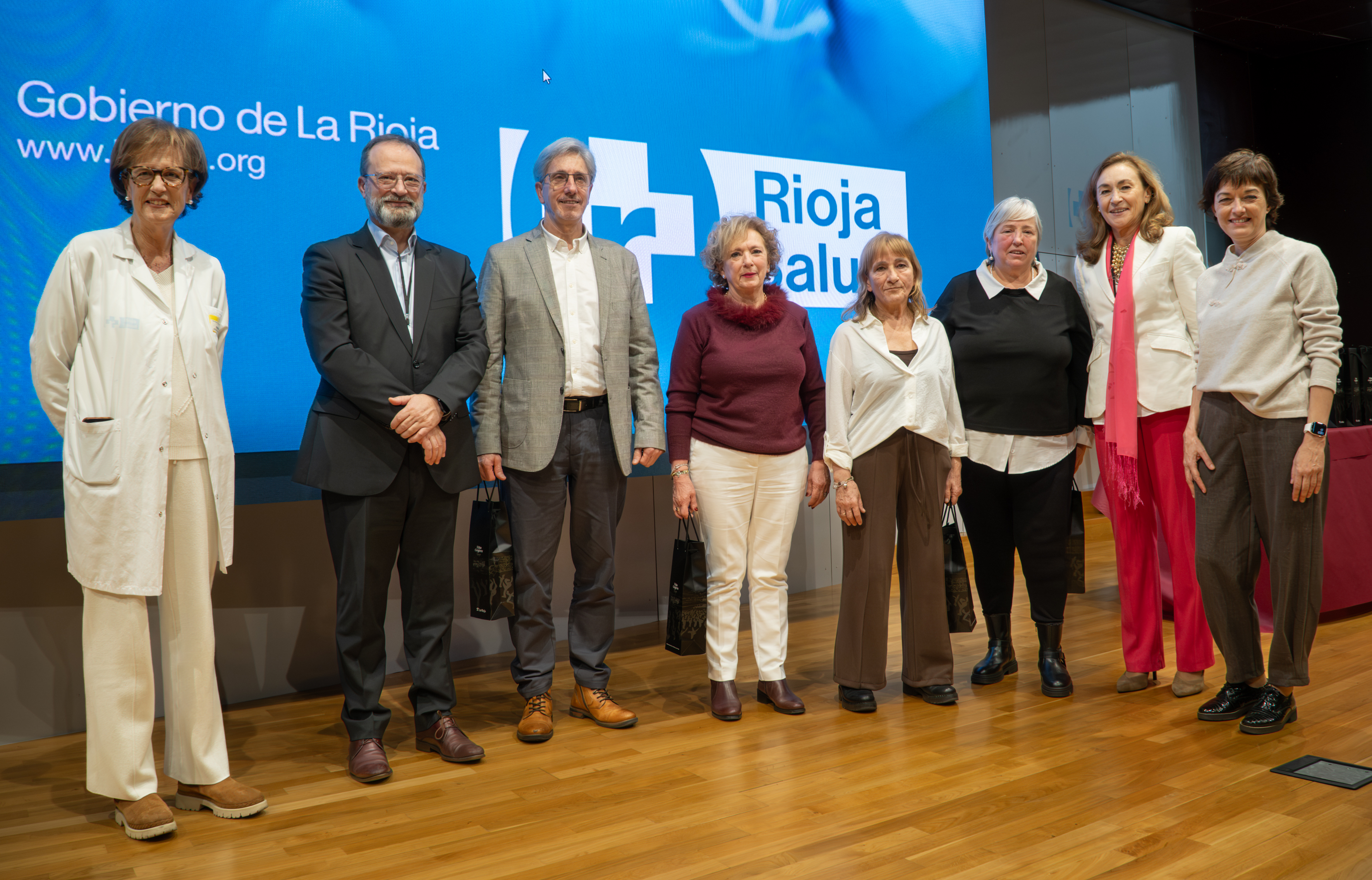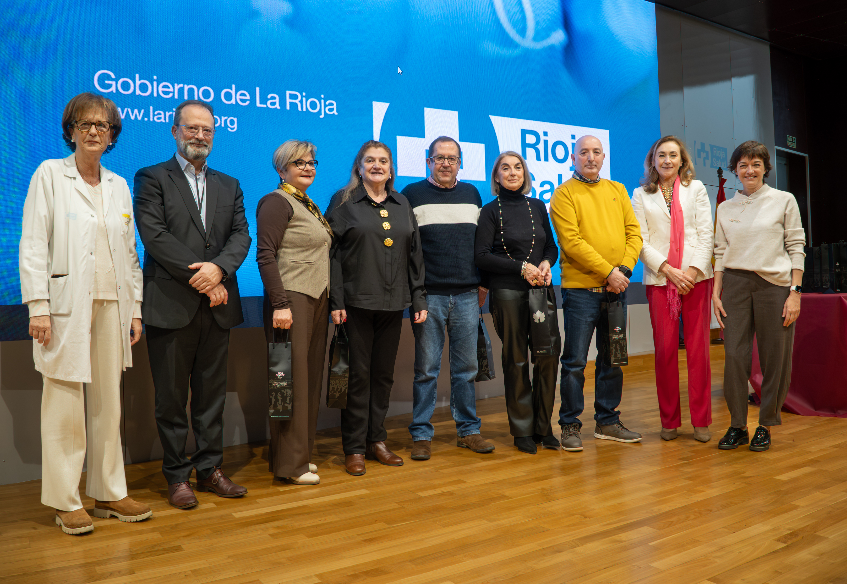 La consejera de Salud y Políticas Sociales, María Martín, acompañada por el gerente del SERIS, Luis Ángel González, ha participado hoy, 19 de diciembre, en Logroño, en el homenaje que el Servicio Riojano de Salud (SERIS) ha brindado a los 136 profesionales de Atención Primaria y Hospitalaria que se han jubilado a lo largo de 2025.