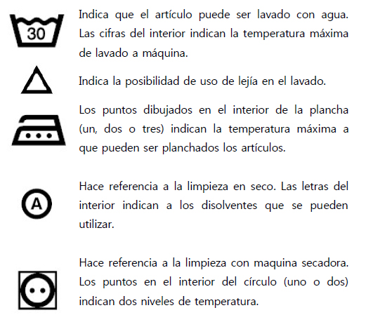 Hay datos que, aunque no son obligatorios, aportan informaciones sobre el producto y su conservación: como lavar (mojado o seco, a mano o a máquina...), si se puede utilizar lejía o no, si admite o no plancha o secadora.