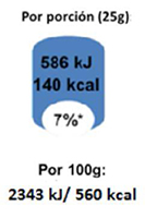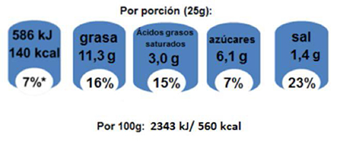 - valor energético y cantidad de grasas, ácidos grasos saturados, azúcares y sal.