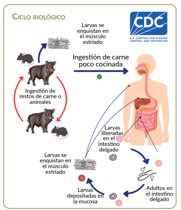 Se asocia fundamentalmente al consumo de carne y productos cárnicos crudos o insuficientemente cocinados procedentes de jabalí o cerdo infectado.