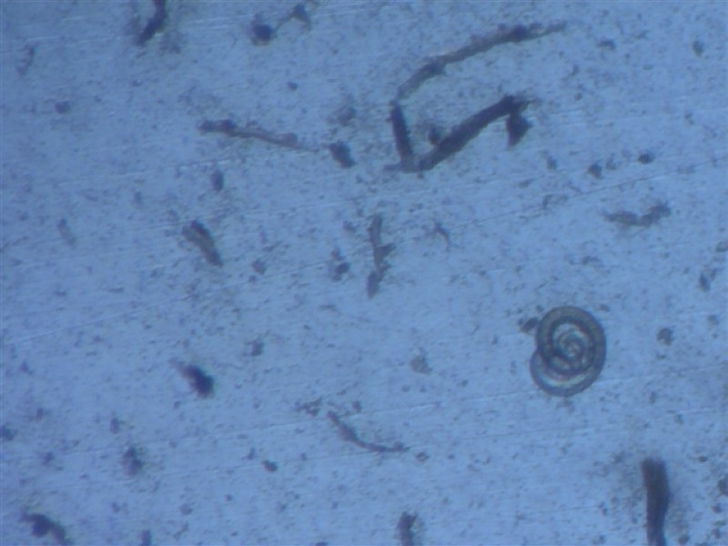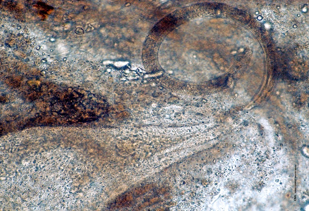 Fotomicrografía de quiste y larva parcialmente fuera del mismo de Trichinella spp. en fibras de tejido muscular