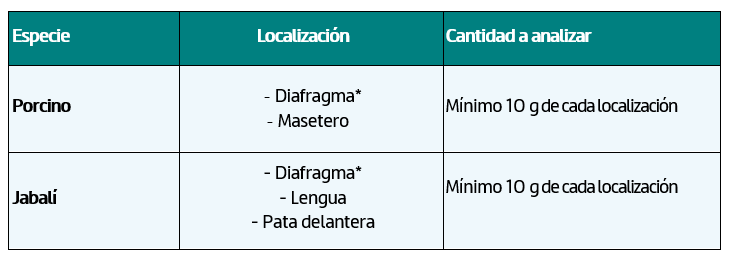 La muestra se debe recoger de las posiciones preferentes. Para porcino y jabalí, los músculos preferentes son: