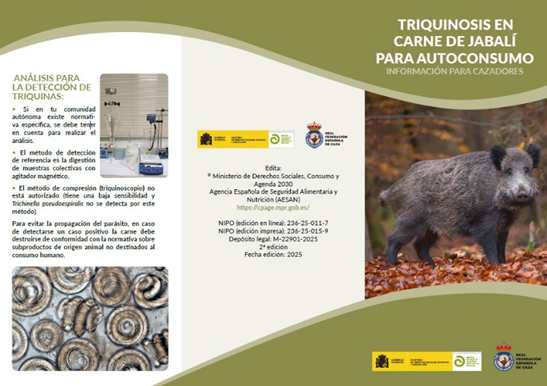 Con el objetivo de concienciar a los cazadores sobre la importancia de someter a análisis de triquina a los jabalíes destinados para autoconsumo, la AESAN, en colaboración con Real Federación Española de Caza, ha publicado un tríptico titulado: “Triquinosis en carne de jabalí para autoconsumo”